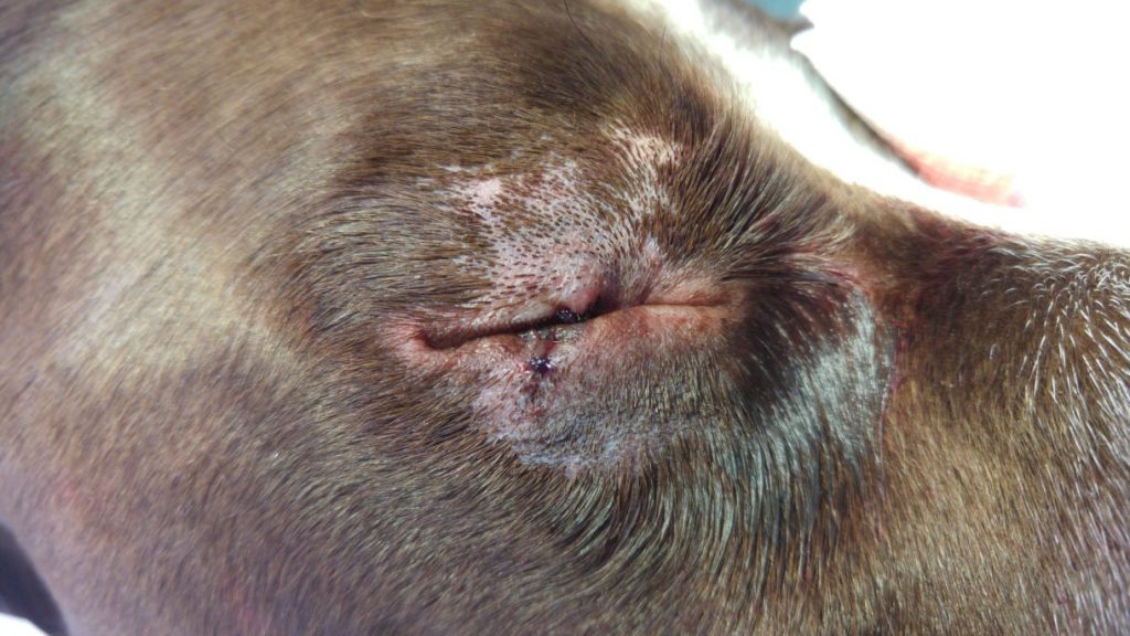Une pommade antibiotique est appliquée pendant cinq jours et la cicatrisation est vérifiée quinze jours après l’intervention. Le port de la collerette est conseillé pendant cette durée pour éviter les automutilations et le retrait prématuré des points.