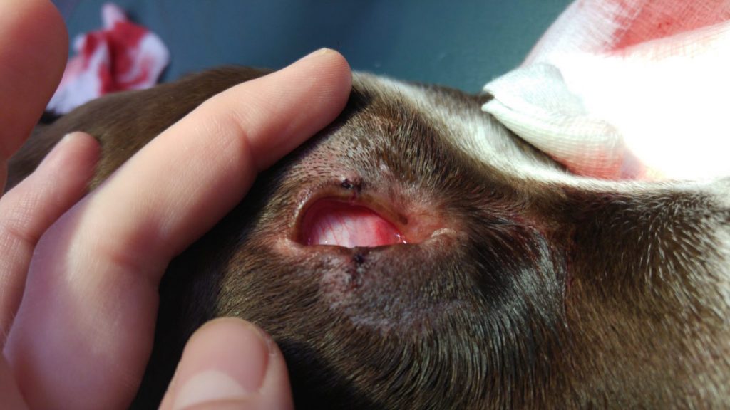 Guiliss est un chien Braque Français de 8 ans présentant 2 masses palpébrales depuis plusieurs mois ayant tendance à grossir.